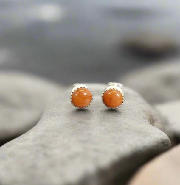 Their listing states, “This is a beautiful set of Lake Superior agate stud earrings in solid silver settings. This agate is a deep orange with great banding. It hails from Minnesota. The settings are about 8.5 mm across with serrated edge bezels to hold the stones.”