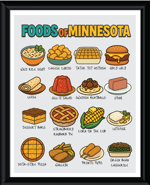 Do you have a foodie in your life? Our state is known for tasty dishes like tater tot hotdish, lutefisk, and Jucy Lucy’s. A company appropriately called “Minnesota Awesome” has a print featuring cartoon-like drawings of these foods and many more. Available in multiple sizes, the print comes on museum-quality archival paper!